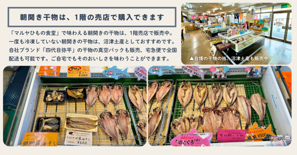 「マルヤひもの食堂」で味わえる「朝開き干物」は、1階売店で販売しています。