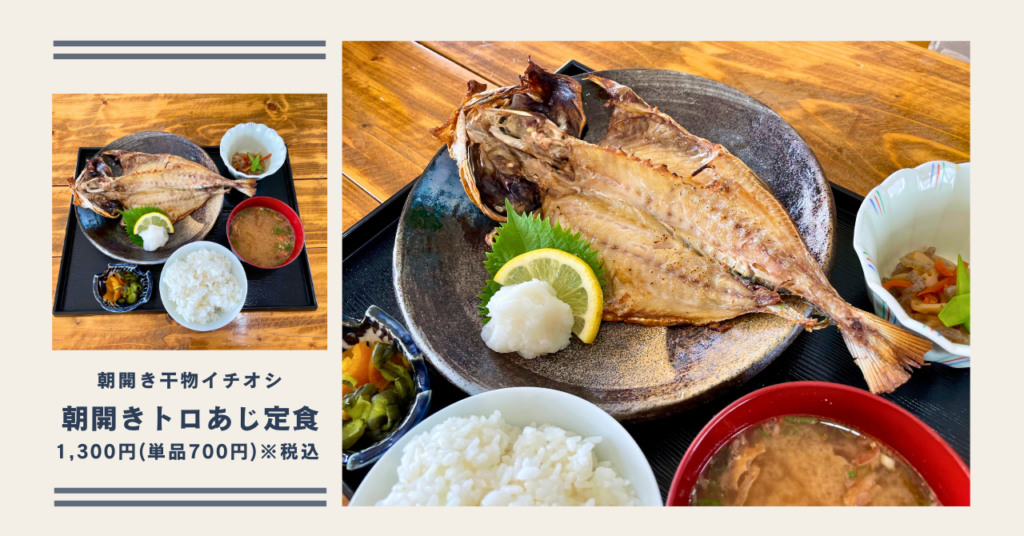どれもおいしそう!お腹に余裕があればいろいろ食べてみたいところですが、人気ナンバーワンメニュー「朝開きトロあじ定食 税込1,300円(単品700円)」をいただきました。
