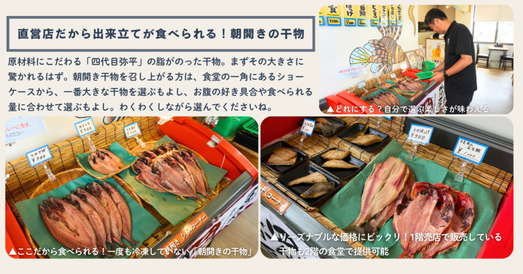 えぼ鯛やつぼ鯛、珍しい深海魚の干物など、食堂のメニュー以外の干物も1階売店で販売されています。これらの直営店でしか手に入らない干物についても、希望があれば食堂で提供可能です。