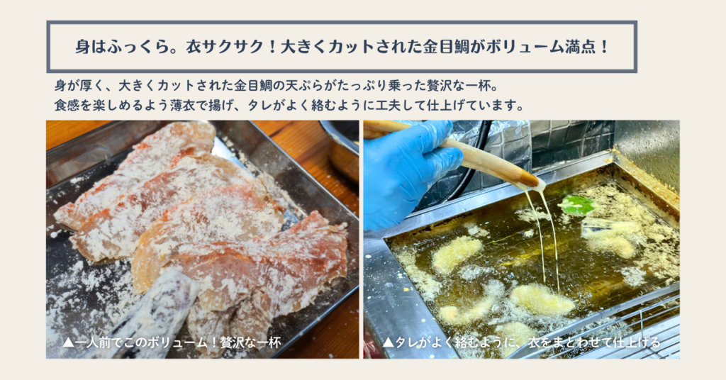 干物以外のメニューの中で、特に人気なのが「金目鯛の天丼」1,300円(税込)。